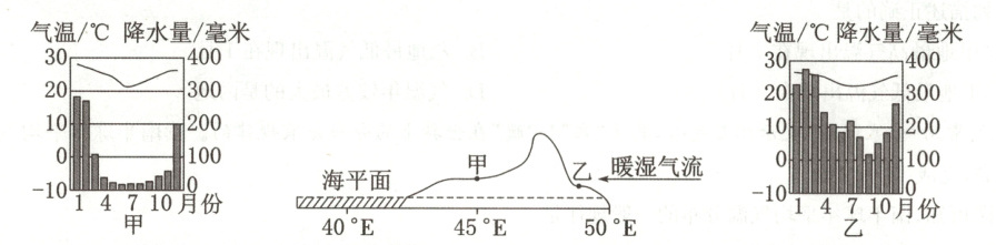 受地形等因素的影响,同一岛屿的两侧可能会形成不同的气候类型。读某岛屿20°纬线的地形剖面图及甲、乙两地气候资料图,完成34~37题。