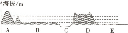 6. 根据海拔和地表起伏特征,可以推断地形D是 (