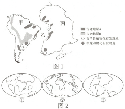 德国科学家魏格纳提出的大陆漂移说认为在两亿年前,地球上各个大洲是相互连接的一块大陆,后来原始大陆分裂成几块大陆,缓慢地漂移分离。图 1 为两大洲古老地层和古生物化石分布示意图,图 2 为大陆漂移图。据此完成 12~13 题。