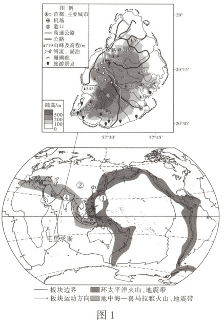 2024 年 9 月 26 日晚,毛里求斯外岛东北海域发生 6.3 级地震。此后又发生了多次余震,火山也频繁喷发。毛里求斯是个多火山、地震的国家,某学校初一年级的学生结合“海洋和陆地的变迁”内容对此展开了研究。图 1 为世界板块和主要火山、地震带分布图及毛里求斯地图。阅读图文资料,回答下列问题。