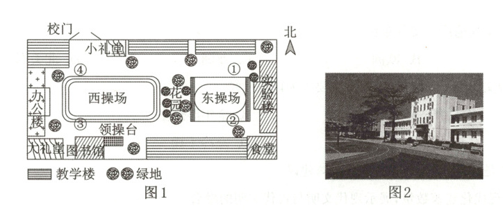 某中学在初一地理实践课上开展了“镜头中的校园”活动。图1为同学们绘制的校园平面图,图2为某同学拍摄的校园照片。据此完成11~13题。