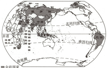 4.(2024·吉林长春)2024年1月,伊朗、沙特阿拉伯等5国成为金砖国家,成员国数量增加到10个。2025年1月,印度尼西亚成为金砖国家正式成员。金砖国家均为发展中国家。下图为金砖国家分布图。金砖国家大部分位于(