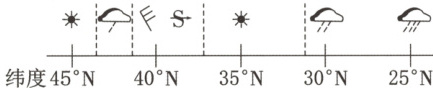 下图为春季某日我国东部某条经线附近地区的天气状况示意图。读图,完成7~8题。