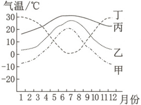 读四地气温年变化曲线图, 完成 $6 \sim 7$ 题。