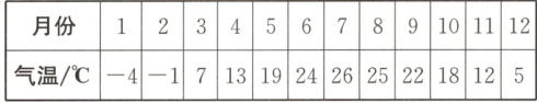 气温/$\mathbf{°C}$ -4 -1 7 13 19 24 26 25 22 18 12 5