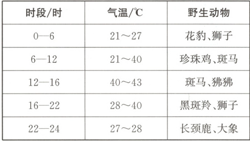 时段/时 气温/$\mathbf{°C}$ 野生动物