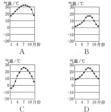 12. 首先,根据表格数据,1月气温-4℃,2月-1℃,3月7℃,4月13℃,5月19℃,6月24℃,7月26℃,8月25℃,9月22℃,10月18℃,11月12℃,12月5℃。绘制气温年变化曲线时,需将各月气温对应到坐标轴上并连接成平滑曲线。观察选项,D选项中1月气温约-4℃,7月气温最高约26℃,且各月气温变化趋势与表格数据一致,如从1月到7月气温逐渐升高,7月后逐渐降低,8月气温(25℃)略低于7月,符合数据。A选项1月气温过高,B选项最高气温出现时间及数值不符,C选项1月气温为正值,均错误。所以12题选D。