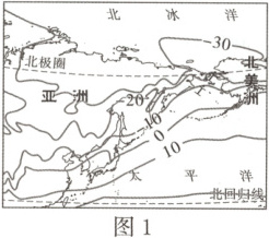 解析:1月等温线密集表示南北温差大(A错);7月等温线稀疏表示南北温差小(B错);1月为北半球冬季,同纬度海洋(太平洋)降温慢,气温高于陆地(亚洲大陆)(C对);7月为北半球夏季,同纬度陆地(亚洲大陆)升温快,气温高于海洋(太平洋)(D错)。