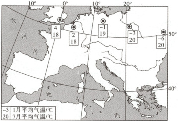 如图为欧洲部分城市 1 月、7 月平均气温状况示意图。读图,完成 10~11 题。