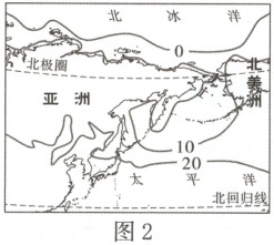 图 1 为世界某区域 1 月等温线分布示意图(单位:℃),图 2 为该区域 7 月等温线分布示意图(单位:℃)。读图,完成 7~9 题。