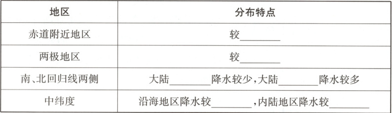 赤道热,降水多;两极寒,降水难;回归线,分两边,陆西岸,降水少,陆东岸,降水丰;中纬度,居内部,距海远,气候干。