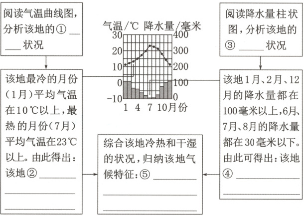 3. ①气温 ②全年高温 ③降水 ④冬季多雨,夏季少雨 ⑤全年高温,冬季多雨,夏季少雨