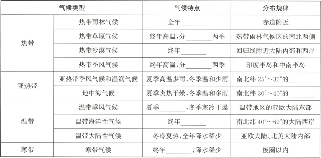 全年高温多雨;干湿;炎热干燥;旱雨;大陆东岸;大陆西岸;高温多雨;温和湿润;严寒