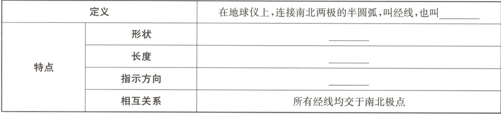 1. 子午线;半圆;相等;南北方向