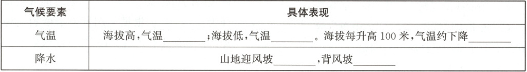 具体表现:海拔高,气温低;海拔低,气温高。海拔每升高100米,气温约下降0.6℃。