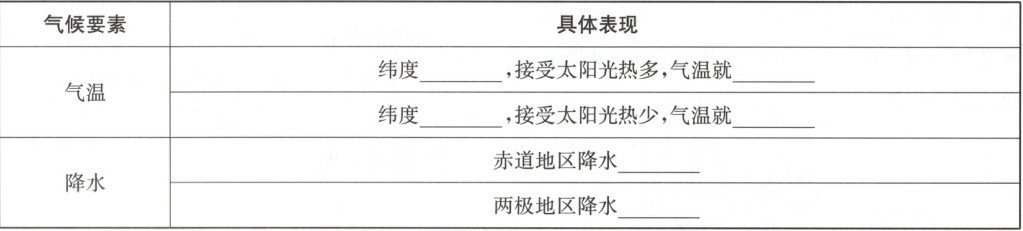 具体表现:纬度低,接受太阳光热多,气温就高;纬度高,接受太阳光热少,气温就低。