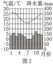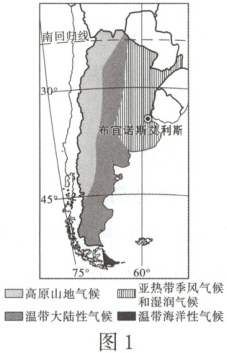 马黛茶由马黛树树叶加工而成,被誉为阿根廷“国茶”。图1为阿根廷气候类型分布图,图2为马黛树种植区气温曲线和降水量柱状图。读图,完成7~8题。
