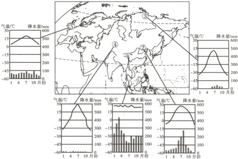 D. 亚热带季风气候和湿润气候分布在太平洋沿岸