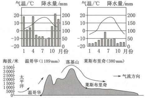 如图是加拿大50°N附近温哥华—莱斯布里奇及其以东部分地区的地形剖面示意图和两城市气候资料图。读图,完成9~10题。