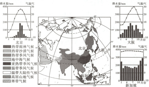 亚洲有三家环球影城,分别在中国北京、日本大阪和新加坡。读亚洲气候类型分布图及三大环球影城所在地气温曲线和降水量柱状图,完成11~13题。