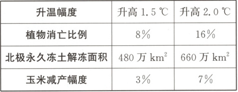 知识拓展:据世界气象组织常年对全球气温监测发现,全球气温不断上升。政府间气候变化专门委员会发布《全球升温1.5℃特别报告》,部分指标如表所示。
