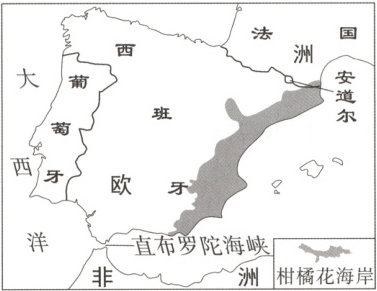 (2024·江苏连云港)西班牙是世界上重要的柑橘栽培国。该国柑橘集中成片种植,集约化经营,每年4—5月柑橘花盛开之时,形成“柑橘花海岸”。如图为该国“柑橘花海岸”分布示意图。据此回答5~6题。