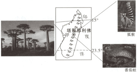 (跨学科·生物)(2024·重庆)2024年1月,小华与父亲前往马达加斯加岛(如图)旅行,在甲地看见了能用粗壮树干蓄水的猴面包树景观,之后来到首都——塔那那利佛附近的森林中,看见了古老而独特的物种——狐猴、番茄蛙。据此完成7~8题。