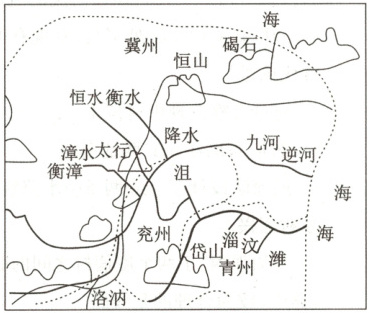 魏晋时期的地图学家裴秀作《禹贡地域图》,开创了中国古代地图绘制学,其采用的是“一分为十里,一寸为百里”的方法。这种“计里画方”即按比例绘制地图。读《禹贡地域图》(局部),完成7~8题。