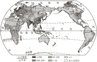 (常考地图)世界人口分布很不均匀。读世界人口分布图,回答3~4题。