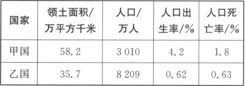读甲、乙两个国家的领土面积和人口数据表,完成1~2题。