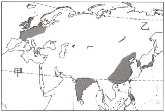 下图中阴影部分是亚欧大陆的人口密集区。读图,回答5~7题。