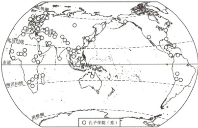 孔子学院(堂)是推广汉语和传播中国文化的机构。截至目前,共有一百多个国家和地区建立了 500 多所孔子学院和 1 000 多个孔子课堂。读孔子学院(堂)及世界语言分布图,完成3~5 题。