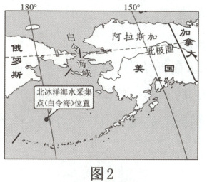 材料二 极地周边经纬网示意图(图1)、北冰洋海水采集点(白令海)位置图(图2)、海水采集图(图3)。