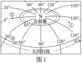 半球,图1中①②③④四点,最接近北冰洋海水采集点的是①