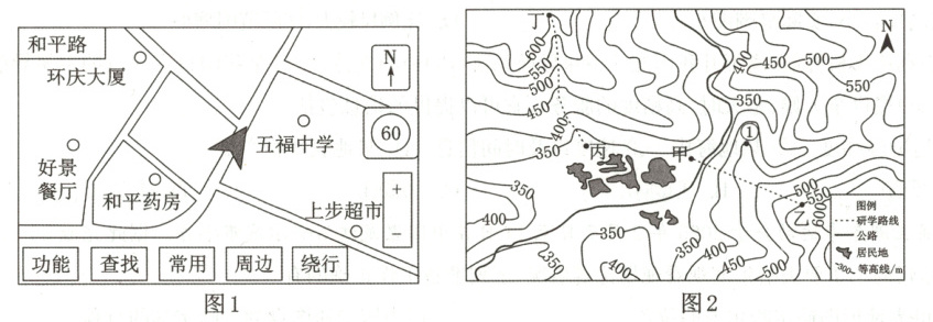 小明周六坐出租车去五福中学地理兴趣活动室进行地理小组活动,参与分层设色等高线地形图绘制研学活动。车上小明发现司机师傅使用手机北斗导航软件。图1是北斗系统的车载导航示意图,图中箭头所示为汽车行进方向。图2是未完成的分层设色等高线地形图。据此完成9~12题。