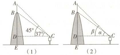 (1)由题意可知,∠BCD = 37°,∠ACD = 45°,∠ACB = 8°,A = 45°,在△ABC中,$\frac{AB}{\sin\angle ACB}$ = $\frac{BC}{\sin A}$,所以BC ≈ $\frac{50×\frac{\sqrt{2}}{2}}{0.14}$ ≈ 250(m),在Rt△BCD中,BD = BCsin∠BCD ≈ 250×0.6 = 150(m),所以山高BE = 150 + 1.5 ≈ 152(m).