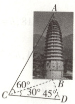 3.【题型二】(2025·黑龙江哈尔滨德强高级中学高一下期中)长庆寺塔,又名“十寺塔”,位于安徽省黄山市歙县的西干披云峰麓,历经 $900$ 多年风雨侵蚀,仍巍然屹立,是中国现存少有的方形佛塔.如图,为测量塔的总高度 $AB$,选取与塔底 $B$ 在同一水平面内的两个测量基点 $C$ 与 $D$,现测得 $\angle BCD = 30^{\circ}$,$\angle BDC = 45^{\circ}$,$CD = 32\sqrt{2}\ m$,在 $C$ 点测得塔顶 $A$ 的仰角为 $60^{\circ}$,则塔的总高度为 (