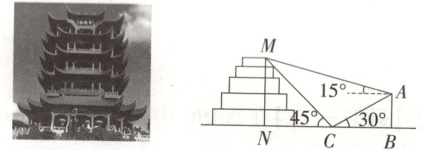 1.【题型二】(2025·黑龙江哈尔滨九中高一下月考)中国古代四大名楼之首的黄鹤楼位于湖北省武汉市武昌区,因唐代诗人崔颢登楼所题的《黄鹤楼》一诗而名扬四海.如图,某同学为测量黄鹤楼的高度 $MN$,在黄鹤楼的正东方向找到一座建筑物 $AB$,高约为 $26\ m$,在地面上点 $C$ 处($B,C,N$ 三点共线)测得建筑物顶部 $A$、黄鹤楼顶部 $M$ 的仰角分别为 $30^{\circ}$ 和 $45^{\circ}$,在 $A$ 处测得楼顶部 $M$ 的仰角为 $15^{\circ}$,则黄鹤楼的高度约为 (
