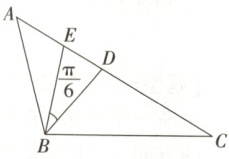 6.$\frac{\pi}{6}$,$8(\sqrt{3}-1)$[提示:因为$\sin\angle ABC=\sin\frac{7\pi}{12}=\sin(\frac{\pi}{4}+\frac{\pi}{3})=\sin\frac{\pi}{4}\cos\frac{\pi}{3}+\cos\frac{\pi}{4}\sin\frac{\pi}{3}=\frac{\sqrt{6}+\sqrt{2}}{4}$,$\cos\angle ABC=\cos\frac{7\pi}{12}=\cos(\frac{\pi}{4}+\frac{\pi}{3})=\cos\frac{\pi}{4}\cos\frac{\pi}{3}-\sin\frac{\pi}{4}\sin\frac{\pi}{3}=\frac{\sqrt{2}-\sqrt{6}}{4}$,在$\triangle ABC$中,由余弦定理得$AC^{2}=AB^{2}+BC^{2}-2AB· BC\cos\angle ABC=8(\sqrt{3}+1)^{2}$,$\therefore AC = 2\sqrt{2}(1+\sqrt{3})$,根据正弦定理得$\frac{AC}{\sin\frac{7\pi}{12}}=\frac{AB}{\sin\angle ACB}$,解得$\sin\angle ACB=\frac{4}{2(\sqrt{2}+\sqrt{6})}=\frac{1}{2}$。因为$0<\angle ACB<\frac{\pi}{2}$,所以$\angle ACB=\frac{\pi}{6}$。设$\angle CBD=\theta$,其中$0\leqslant\theta\leqslant\frac{5\pi}{12}$,则$\angle BDC=\frac{5\pi}{6}-\theta$,$\angle BEC=\frac{2\pi}{3}-\theta$,在$\triangle BCD$中,由正弦定理得$\frac{BD}{\sin\frac{\pi}{6}}=\frac{BC}{\sin\angle BDC}$,得$BD=\frac{\sqrt{2}}{2\sin(\frac{5\pi}{6}-\theta)}$,在$\triangle BCE$中,由正弦定理得$\frac{BE}{\sin\frac{\pi}{6}}=\frac{BC}{\sin\angle BEC}$,得$BE=\frac{\sqrt{2}}{2\sin(\frac{2\pi}{3}-\theta)}$,则$BD + BE=\frac{\sqrt{2}}{2}(\frac{1}{\sin(\frac{5\pi}{6}-\theta)}+\frac{1}{\sin(\frac{2\pi}{3}-\theta)})=\frac{4\sqrt{2}(\sqrt{3}+1)(\sin\theta+\cos\theta)}{\sqrt{3}+4\sin\theta\cos\theta}$。令$t=\sin\theta+\cos\theta$,$t\in[1,\sqrt{2}]$,则$\sin\theta\cos\theta=\frac{t^{2}-1}{2}$,$BD + BE=f(t)=\frac{4\sqrt{2}(\sqrt{3}+1)t}{2t^{2}-(2-\sqrt{3})}=\frac{4\sqrt{2}(\sqrt{3}+1)}{2t-\frac{2-\sqrt{3}}{t}}$,易知分母$g(t)=2t-\frac{2-\sqrt{3}}{t}>0$,且是一个单调递增函数,则$f(t)$是一个单调递减函数,当$t=\sqrt{2}$时,$f(t)$有最小值$f(t)_{\min}=\frac{8(\sqrt{3}+1)}{2+\sqrt{3}}=8(\sqrt{3}-1)$。]