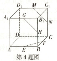 4.CD[提示:如图,因为G,H分别为A₁B₁,B₁B的中点,所以GH//A₁B,同理可证MN//CD,又易知四边形A₁BCD为平行四边形,所以A₁B//CD,所以GH//MN,延长MN交直线DC于点P,因为MC₁//PC,所以∠MC₁N=∠PCN,又因为C₁N=CN,∠MNC₁=∠PNC,所以△MC₁N≌△PCN,所以PC=C₁M,延长EF交DC的延长线于点Q,同理可证QC=BE,因为C₁M=1/2C₁D₁=1/2AB=BE,所以PC=QC,即点P,Q重合,所以MN,EF相交,由异面直线的定义结合图形可知GH,EF异面,故A,B正确,C,D均错误.]