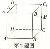 2.$\frac{25}{6}+\frac{3\sqrt{5}}{2}+\frac{\sqrt{13}}{3}$[提示:如图所示,连接$BM$,因为平面$AA_1D_1D//$平面$BCC_1B_1$,所以截面与两平面的交线平行,过点$N$作$NF// BM$交$AA_1$于点$F$,连接$BF$,同理过点$M$作$ME// BF$交$C_1D_1$于$E$,连接$NE$,则面$BMENF$即为所求截面,延长$EN$,$BF$交于$Q$,延长$BM$,$AE$交于$P$,易知$P$在直线$B_1C_1$上,$Q$在直线$A_1B_1$上.因为$C_1M// BB_1$,$M$是$CC_1$的中点,所以$\triangle BCM\cong\triangle PC_1M$,可得$C_1P=BC=2$,因为$\triangle ND_1E\sim\triangle PC_1E$,所以$\frac{D_1E}{EC_1}=\frac{ND_1}{PC_1}=\frac{1}{2}$,所以$D_1E=\frac{1}{2}EC_1$,可得$D_1E=\frac{2}{3}$,$EC_1=\frac{4}{3}$,$A_1Q=D_1E=\frac{2}{3}$.因为$A_1F// BB_1$,所以$\frac{A_1F}{BB_1}=\frac{A_1Q}{QB_1}=\frac{\frac{2}{3}}{\frac{2}{3}+2}=\frac{1}{4}$,所以$A_1F=\frac{1}{2}$,$AF=\frac{3}{2}$,所以$BF=\sqrt{2^2+(\frac{3}{2})^2}=\frac{5}{2}$,$FN=\sqrt{1^2+(\frac{1}{2})^2}=\frac{\sqrt{5}}{2}$,$NE=\sqrt{1^2+(\frac{2}{3})^2}=\frac{\sqrt{13}}{3}$,$EM=\sqrt{(\frac{4}{3})^2+1^2}=\frac{5}{3}$,$BM=\sqrt{2^2+1^2}=\sqrt{5}$,所以截面五边形$BMENF$的周长为$\frac{5}{2}+\frac{\sqrt{5}}{2}+\frac{\sqrt{13}}{3}+\frac{5}{3}+\sqrt{5}=\frac{25}{6}+\frac{3\sqrt{5}}{2}+\frac{\sqrt{13}}{3}$.