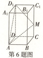 6.$\frac{4}{3}$提示:把长方体的侧面$DCC_1D_1$展开到长方形$ACC_1A_1$所在的平面,如图所示,易知$AC=\sqrt{1 + 3}=2$,当$A$,$M$,$D_1$在同一直线上时,$MD_1+MA$取得最小值,$A_1D_1=2 + 1=3$,$AA_1=2$,则$AD_1=\sqrt{3^2+2^2}=\sqrt{13}$,$\therefore MD_1+MA$的最小值为$\sqrt{13}$,此时$\frac{CM}{DD_1}=\frac{AC}{AD_1}=\frac{2}{3}$,$\therefore CM=\frac{2}{3}×2=\frac{4}{3}$.