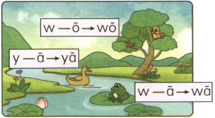 一 只 青 蛙 在 水 中 的 荷 叶 上 ,对 应 拼 音 “w—ā→wā”;