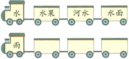 第一行小火车上的文字依次为“水、水果、河水、水面”,都是与“水”相关的词语;按照此规律,第二行已给出“雨”字,后续可填入与“雨”相关的词语,比如:
