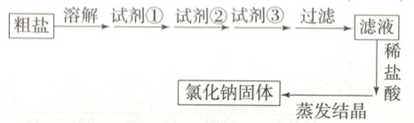 4.D[提示:A.除去$\mathrm{Mg^{2+}}$用氢氧化钠溶液,发生的主要反应为:$\mathrm{Mg^{2+}+2OH^-=Mg(OH)_2\downarrow}$,A正确;B.由于过量的氯化钡需要用碳酸钠溶液除去,因此碳酸钠溶液一定在氯化钡溶液的后面加入,则试剂①一定不是$\mathrm{Na_2CO_3}$溶液,B正确;C.检验$\mathrm{SO_4^{2-}}$是否除尽:取少量滤液,加稀盐酸酸化,再加$\mathrm{BaCl_2}$溶液,C正确;D.滤液加稀盐酸时发生反应:$\mathrm{H^++OH^-=H_2O}$、$\mathrm{2H^++CO_3^{2-}=CO_2\uparrow+H_2O}$,D错误。]