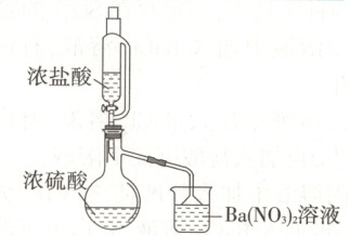 (2)浓盐酸滴入浓硫酸中以后放出的热量使部分浓盐酸中的HCl挥发出来,致使烧瓶内出现白雾。HCl气体会将$\mathrm{H_2SO_4}$带出,$\mathrm{H_2SO_4}$与$\mathrm{Ba(NO_3)_2}$反应生成白色沉淀$\mathrm{BaSO_4}$
