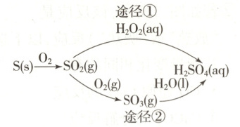 5.D[提示:选项 A,$SO_2(g)$变为$SO_2(l)$是放热过程,即$S(s)+O_2(g) \xlongequal{ }SO_2(l)$放出热量更多。放热反应的$\Delta H<0$,放出热量越多,$\Delta H$越小,所以$\Delta H_a<\Delta H_b$,A 错误。选项 B,根据盖斯定律,途径②的热化学方程式可由$SO_2(g)+\frac{1}{2}O_2(g) \xlongequal{ }SO_3(g) \quad \Delta H_2$与$SO_3(g)+H_2O(l) \xlongequal{ }H_2SO_4(aq) \quad \Delta H_3$相加得到:$SO_2(g)+\frac{1}{2}O_2(g)+H_2O(l) \xlongequal{ }H_2SO_4(aq) \quad \Delta H=\Delta H_2+\Delta H_3$。途径①为$SO_2(g)+H_2O(aq) \xlongequal{ }H_2SO_4(aq) \quad \Delta H_1$,若$\Delta H_1<\Delta H_2+\Delta H_3$,说明$H_2O_2(aq)$分解生成$H_2O(l)$和$O_2(g)$是放热反应,即 2 mol $H_2O_2(aq)$的能量大于 2 mol $H_2O(l)$和 1 mol $O_2(g)$的总能量,B 错误。选项 C,对于反应$SO_2(g)+\frac{1}{2}O_2(g) \xlongequal{ }SO_3(g)$,$\Delta H_2$=反应物键能之和-生成物键能之和,若$\Delta H_2<0$,则 1 mol $SO_2$和 0.5 mol $O_2$的键能之和小于 1 mol $SO_3$的键能,C 错误。选项 D,中和热是指在稀溶液中,强酸和强碱发生中和反应生成 1 mol 水时放出的热量,为 57.3 kJ/mol。含 0.5 mol/L $H_2SO_4$的稀溶液,因未告知溶液体积,无法确定$H_2SO_4$的物质的量,与足量 NaOH 稀溶液反应生成水的物质的量不确定,所以放出的热量可能小于 57.3 kJ,D 正确。]