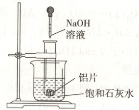 (2)①铝片逐渐溶解、铝片上有大量气泡产生、试管内的饱和石灰水中出现白色浑浊;②产生上述现象的原因是铝和 NaOH 溶液反应生成$H_2$,且是放热反应,$Ca(OH)_2$的溶解度随温度的升高而降低,因此当温度升高时,有氢氧化钙析出。]