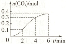 1.D[提示:随着反应进行c(H⁺)减小,而前4min内反应速率变大,根据反应是放热反应,可推出前4min内温度对反应速率的影响比浓度大,A、B正确;在2~4min内n(CO₂)的变化量最大(或曲线的斜率最大),可判断出平均反应速率最大,C正确;由题意及图可知,该题不知道容器体积,故不能表示出反应速率,D不正确。]