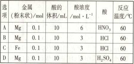 6.D[提示:硝酸与镁反应不生成氢气,Mg比Fe活泼,与酸反应较剧烈;B和D相比较,D中氢离子浓度较大,反应速率较大。]